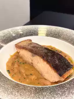 The salmon was pan-seared to a golden crispy surface, tender and juicy, served with white bean sauce, delicious and flavorful.