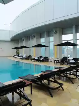 The 59th-floor gym has floor-to-ceiling windows facing Victoria Harbour, and all equipment is top-tier TechnoGym! The best part is the rooftop heated pool—swimming to the edge feels like you're floating above Central (remember to bring a waterproof phone case!)