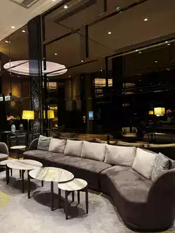 The streamlined glass curtain wall building stands side by side with IFC. The lobby features understated luxury with marble walls and art installations, and a butler hands you a welcome drink at check-in (attention to detail is perfect!)