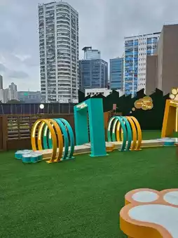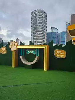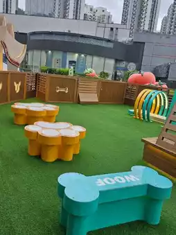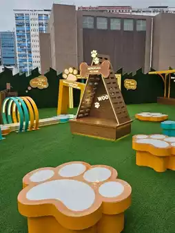 Located at the #L5 Sky Garden, the Pet Park covers 1,800 square feet and features a Pet Glamping theme. The entire area is covered with lush artificial grass, making it feel like you're outdoors, perfect for chilling and running freely! The park is divided into three main zones: the "Photo Zone" for capturing adorable pet moments that are perfect for likes; the "Adventure Zone" equipped with facilities for pets to run and jump; and the "Rest Zone" with shaded benches where owners and pets can relax and recharge.