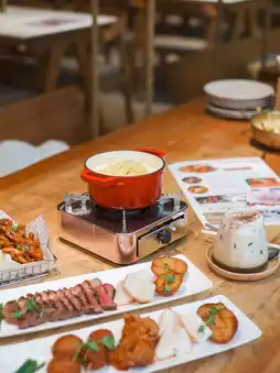 When it arrived, we saw so much cheese! The aroma was amazing as soon as it was served, and the cheese stretches really high~ The ingredients include a medium rare steak 🐮, fried chicken, takoyaki, and other side dishes. We didn’t expect steak and cheese hot pot to go so well together 🤩 The beef is flavorful and tender. However, the portion is quite large, recommended for 3-4 people to share 😙