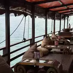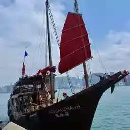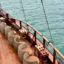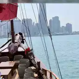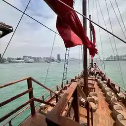I bought the dim sum cruise ticket this time, costing HKD 399. Boarding at 1 PM, stepping on board felt like entering an old movie! The red sails raised high, the deck covered with clean wooden planks, deck chairs, cushions, and wine glasses all set up together, instantly giving off a "I don’t have to work hard today" vibe~