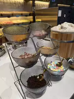 The food area also has a variety of hot pot ingredients (vegetables, meatballs), Taiwanese snacks, ice cream, tofu pudding, taro balls + toppings 👍🏻