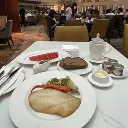 I ordered a pan-fried fish with vegetables, along with watermelon slices and raisin multigrain toast. The flavors were fresh and appetizing. For drinks, I had hot black coffee (with unlimited refills), which was aromatic and truly the perfect breakfast pairing. The staff were friendly, and the food was served quickly, making me feel very welcomed.