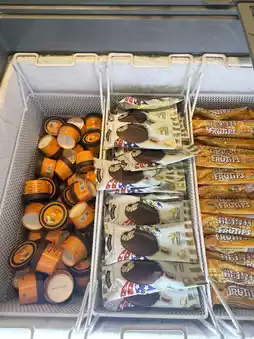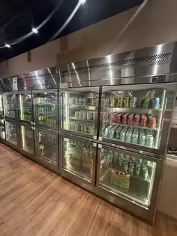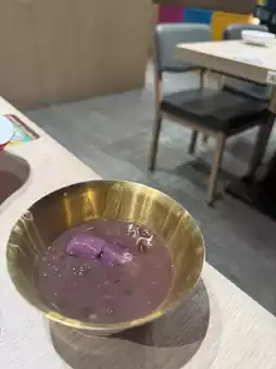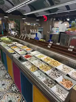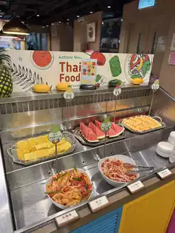 The self-service area has a wide variety, including Hainan chicken, fruits, various types of meatballs, vegetables, sea shrimp, desserts, and sweet soups—everything you could want. The desserts and sweet soups come in many varieties.