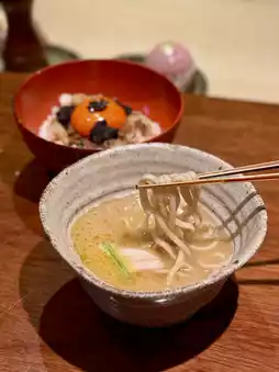 The chicken broth is rich and thick, with each noodle coated in flavorful soup, chewy and delicious.