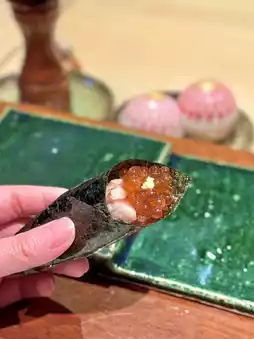 The signature half-cooked chicken tenderloin is wrapped in seaweed and topped with salmon roe, creating rich layers of flavor.