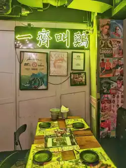 The shop has a trendy industrial style ๐ญ, with cement walls covered in neon signs ๐ก and chicken wing-themed graffiti ๐จ, creating a very chill atmosphere ๐!