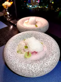 Rich sweet vinegar sauce that doesn’t overpower the milky flavor of the tender and springy slow-cooked Bresse pigeon, paired with dried Iberico ham thigh with a texture similar to coconut jelly, and a palate-cleansing maitake mushroom black pepper clear soup.