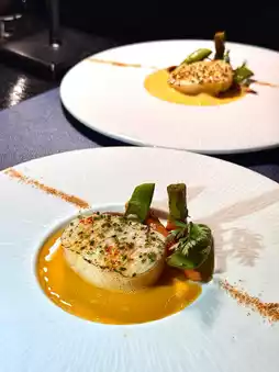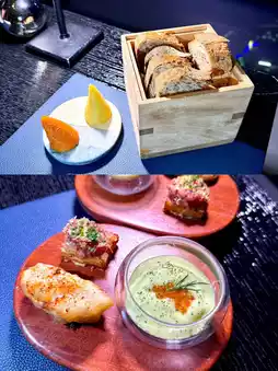 Light mousse appetizer with green apple and tarragon juice paired with salmon cubes. Fried cheese tempura. Australian Wagyu beef tartare with miso.