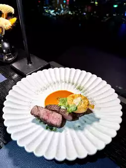 Japanese Miyazaki A4 slow-cooked Wagyu sirloin with an explosion of fat in every bite. Grilled sauce. Lemon jelly. Crisp and mildly sweet radish with sour pickled radish cubes. Served on a bed of slightly crispy pork tail meat.
