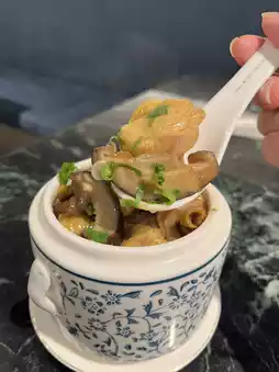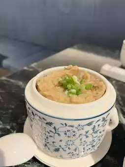 Steamed chicken with shiitake mushrooms – the chicken pieces are tender, and the chicken oil seeps into the rice, making it more flavorful. Steamed pork with preserved mustard greens – the pork patty is springy and chewy, paired with sweet preserved mustard greens, perfect with rice.