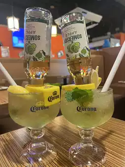 We ordered two Apple Cider Ritas 🩷🩷🩷🩷🩷, an alcoholic slushie made with apple wine. It’s really refreshing to drink in this weather.