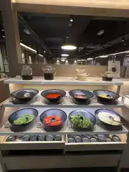- Drinks Area: Offers cold brew teas including Osmanthus Oolong, Plum Hawthorn Tea, sodas, and a hot drinks counter with options like brown sugar ginger tea.