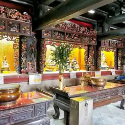 Tsing Shan Monastery consists of several distinctive buildings. For example, the Main Hall enshrines Shakyamuni Buddha, Amitabha Buddha, and Medicine Buddha, while the Dharma Protector Hall is dedicated to Wei Tuo. The roofs of these two halls are decorated with Shiwan ceramics; the mountain gate, guest hall, and merit hall are adorned with finely crafted gray plaster.