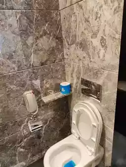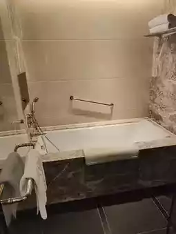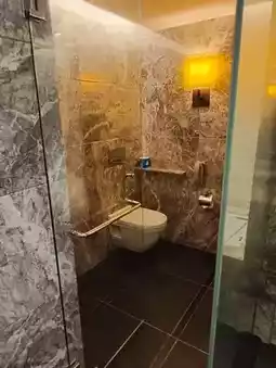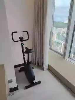 The bedroom has a comfortable king-size bed and a stationary exercise bike. The main bathroom includes a bathtub, shower, and a toilet separated by frosted glass, along with a Dyson hairdryer.