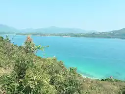 The island has two piers, Kiu Tsui Island and Half Moon Bay. We landed at Half Moon Bay. Under the blue sky and white clouds, the sea showed a dreamy turquoise color, and the distant hills were covered with dense green trees, refreshing the mind. The coastal rocks and fine sand formed a peaceful seaside painting, with a few red balloons floating in the air, adding a lively touch.