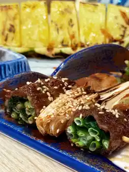 ▪️ Thinly Sliced Beef Tongue Wrapped with Green Onion: Beef tongue sliced thin enough to see through, wrapped with bright green scallions, charcoal aroma mixed with dripping meat juices.