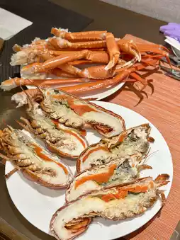 The seafood selection is abundant, with plenty of crab legs, mussels, and cooked shrimp—no need to fight over them. The crab legs are fresh and sweet; the lobsters are big, rich in roe and meat, eating a few already makes it worth it; the oysters are shucked fresh, tasting sweet, and with a squeeze of lemon juice, they’re even more refreshing. For sashimi, the salmon is fatty and flavorful, the sea bream slices are thick, and the sweet shrimp is full of rich shrimp paste.
