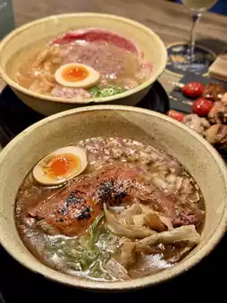 The chicken thigh🍗 is seasoned with Japanese soy sauce, pepper, and slow-cooked at 60°C for 2 hours, then grilled until the skin is slightly charred. The texture is super tender and juicy. The broth is made from chicken white broth with added Japanese soy sauce and black garlic oil, rich in flavor. The ramen is well-coated with sauce and served with a soft-boiled egg in broth, fried burdock, scallions, and onions, enhancing the taste.