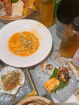 Sashimi ๐ The package includes ๐ฐ honey-glazed abalone slices, sea snails, surf clams ๐ Hokkaido scallops, king fish sashimi ๐ salmon ๐ premium red shrimp ๐ฆ Thai tiger prawns ๐น๐ญ. All are fresh with vibrant colors โจ. The king fish sashimi is especially tender ๐๐ป.