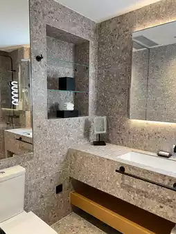 From the moment you step into the soaring lobby, you’re greeted by a stunning mosaic of underwater dancers and crystalline neon chandeliers — a mood board come to life. The design nods to Hong Kong’s soul: Tangram‑mirror elevators, tailoring‑inspired lamp shades, and seaside terrazzo floors — each a playful tribute to the city’s heritage .