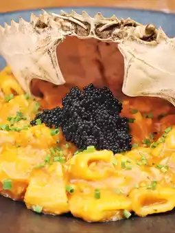 The crab meat-rich shrimp sauce handmade ring pasta🦀🍝 is shaped in cute rings💫, with a chewy texture that holds the sauce well💧. The shrimp sauce🦐 is incredibly rich, packed with lots of fresh sweet crab meat🦀, and topped with plenty of black caviar🖤, delivering an intense burst of umami🌊!