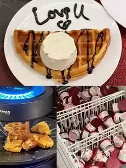 Desserts include a variety of Western cakes and fresh fruits, plus a DIY waffle station where you can make waffles crispy on the outside, soft inside with egg aroma, and add your own toppings; a chocolate fountain for dipping fruits and marshmallows; ice cream cups featuring local brand CoCoberry and famous Häagen-Dazs.