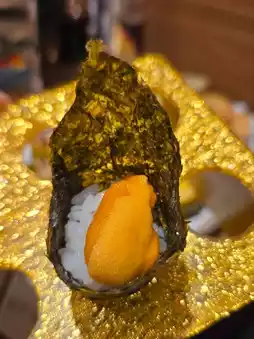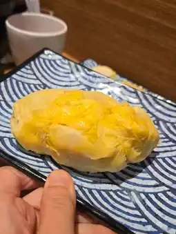 There are plenty of sashimi options too: yellowtail, salmon, swordfish belly scallops, surf clams, red shrimp, etc. The sashimi is fresh, the yellowtail is very fatty and delicious 😋 They even have sea urchin hand rolls, small pieces, one bite each, you can eat several without getting too full 😂