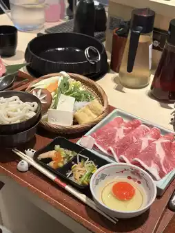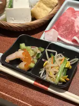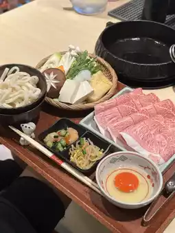 Each set includes an appetizer, assorted vegetables, Ran-Oh egg, Japanese rice or Sanuki udon, and dessert, quite generous! The assorted vegetables include shiitake mushrooms, tofu, tofu skin, green onions, baby bok choy, and taro threads, with many options to add to the sukiyaki sauce or kelp broth according to your preference. This time I chose Sanuki udon, which absorbed the sukiyaki broth very well and was delicious with a chewy texture! The dessert includes two pieces of warabi mochi, chewy and tasty.