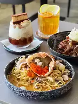 A whole crab shell stuffed with crab meat and crab roe seasoned with miso, very fragrant, topped with sweet crab meat shreds and plenty of crunchy crab roe; the al dente spaghetti is coated with creamy cheese sauce and drizzled with rich lobster sauce for a fresh seafood taste, accompanied by squid slices, scallops, and shiitake mushrooms.