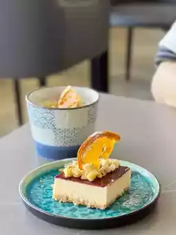 Today's dessert is blueberry cheesecake, dense and delicate with a rich cheese flavor. The sweet and sour blueberry sauce balances the richness, and crispy flakes add texture.