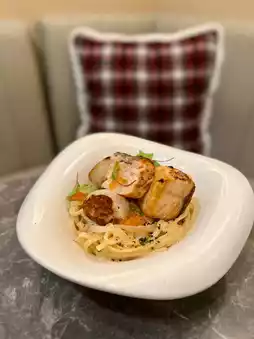 The pasta toppings are impressive, featuring large scallops, pan-seared salmon cubes, and salmon roe on top🐟 The pasta underneath is made with mentaiko, making the whole dish very flavorful🍝