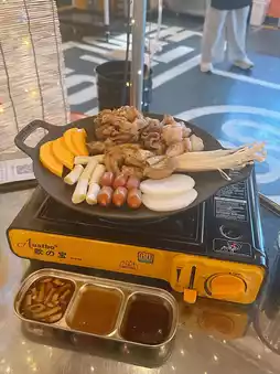 Unlimited Korean beef sausage🐄 add-on $99💰 includes Korean beef slices🥩 grilled beef sausage🐂 sausage, rice cakes, enoki mushrooms🍄🟫 onions🧅 pumpkin🎃 dipped in 3 different sauces to help cut the richness☺️