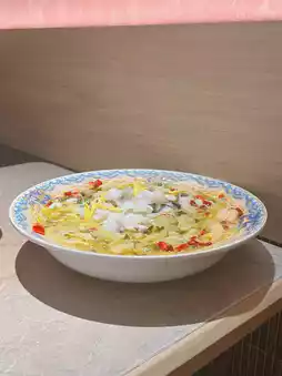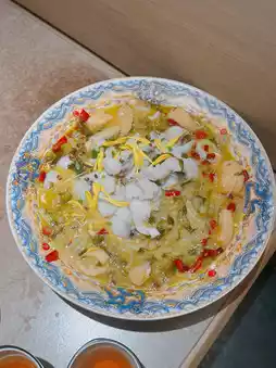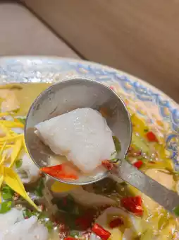 Sour Fish in Golden Broth🐟 à la carte $248💰 Very large portion😍 The sour vegetable broth is tangy and rich🤤 The fish is fresh and tender☺️ Plus pickled vegetables🥬 tofu puffs, celery, and sweet potato noodles🍜