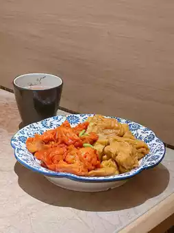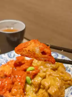 Two-Color Wheat Gluten🥢 à la carte $78💰 Comes in curry vegetarian and sweet and sour vegetarian flavors💛🧡 The wheat gluten has a chewy texture😆 and is very flavorful😗 but is a bit too cold for my liking🥺