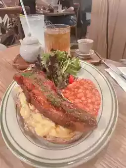 The house-made thick-cut smoked bacon is a surprise, very appealing when served 🤩, pan-fried to a crispy golden brown on both sides. The meat is super tender and flavorful, with a smoky salty taste that's amazing. It’s paired with creamy scrambled eggs, sourdough toast, fresh tomato sauce, and baked beans. The sourdough toast is smoky, chewy, and crispy, making it super satisfying.