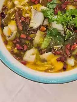 The sour and spicy flavors of the pickled fish are perfectly balanced. The fish slices are tender and boneless, accompanied by crunchy, appetizing pickled vegetables and chewy sweet potato noodles. The noodles absorb all the tangy and spicy flavors of the golden broth, making it addictive.
