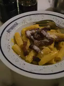 The restaurant specializes in authentic Italian dishes, among which the Rigatoni alla Carbonara is made with egg yolk, smoked pork cheek, and goat cheese, delivering a rich flavor. The rigatoni is cooked al dente, savory and delicious.