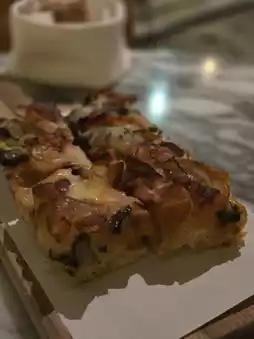 Another signature dish is the Roman-style square thin-crust pizza, baked to order, with a crispy and light crust and abundant toppings.