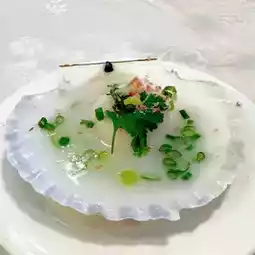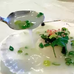 Each of us ordered a slow-cooked scallop in rice soup. The scallops were gently cooked in the rice broth, making them tender and sweet, with a rich rice aroma. A little bit of Jinhua ham was added to make the flavor even more complex.