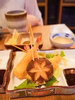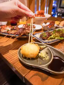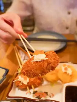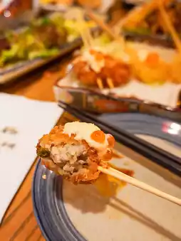 Kushiage Jumbo Prawn 🍤 Kushiage Crab Meat Hiroshima Oyster 🦪 Kushiage Salmon Roe Scallop, Kushiage Soft-boiled Egg 🥚 Kushiage Chicken with Brown Mushroom 🍄🟫