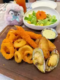 The fried platter includes onion rings, honey chicken wings, fries, and calamari rings πππ A perfect combination of flavors and textures for sharing. The onion rings are crispy on the outside and soft inside, the honey chicken wings are sweet and irresistible, the fries are golden and crispy π€©π€©π€©, and the calamari rings are fresh and tasty.