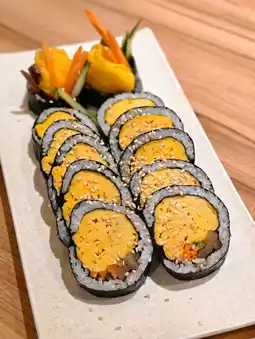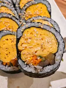 The egg roll wrapped in seaweed is ridiculously thick! The egg aroma is rich yet soft and fluffy, with a slightly moist texture when bitten. Inside, the cucumber and carrot strips are crisp and sweet, with a lingering sesame oil fragrance~