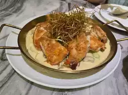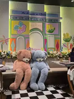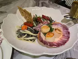 Having read reviews before, I found the restaurant very beautiful, but seeing it in person is even more impressive. The flowers in this color tone are truly endlessly charming, and the decor and colors complement each other beautifully, making dining an enjoyable experience. The menu offers à la carte options as well as two-person sets. I ordered the flaming steak set, which includes the soup of the day, salad, risotto or pasta, and two drinks. The Cognac flaming ribeye steak was impressive. The staff poured the wine and then lit it on fire, which was quite a spectacle. The steak was cooked to medium-well, with a slight char from the flame, a thick texture, juicy with every bite, tender and flavorful.