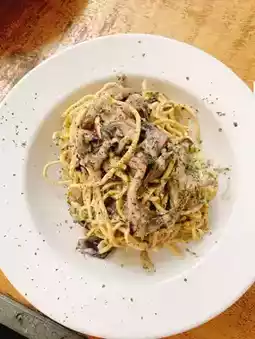 🍝 Black Truffle Mixed Mushroom Pasta: Homemade hand-crafted egg pasta, firm in texture but rich in egg flavor, paired with mixed mushrooms and black truffle sauce for a layered taste.