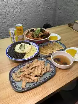 The restaurant specializes in Korean-Chinese cuisine, featuring sweet and sour pork, jjajangmyeon, and other dishes as its highlights; the small shop is simply decorated with limited seating, soft tones paired with wooden tables and warm yellow lighting, creating a cozy and warm atmosphere.