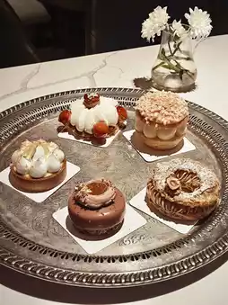 The grand finale includes a variety of French desserts! The server brings five options to the table, and each person chooses one. Each dessert is beautifully presented; the classic lemon tart is smooth with a sweet and sour taste, fresh and pleasant. Another crispy round puff pastry filled with smooth and dense hazelnut cream is rich and silky.