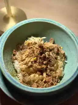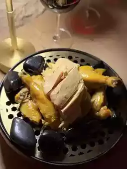 Signature flaming apricot flower chicken looks amazing and tastes great, drizzled with whiskey, creating a spectacular flame effect, perfect for photos. The chicken meat is tender and smooth, paired with crispy chicken skin rice and homemade sauce, each bite bursting with chicken aroma, leaving a lasting impression.