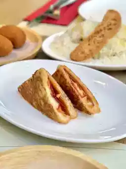 The sandwich is crispy, filled with Spanish chorizo and mozzarella cheese, savory and flavorful.